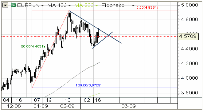 Eurozłoty w dalszym ciągu utrzymuje się powyżej istotnego wsparcia na poziomie 4,40, wyznaczonego przez dwa minima lokalne z 9 lutego i 16 marca tego roku ustanowione tuż powyżej 50% zniesienia fib całości impulsu wzrostowego z okolic 3,8700. Dopóki okolice 4,40 są bronione , to ostatnie umocnienie złotego należy traktować jako korektę prostą. Najbliższe wsparcie wyznacza poziom 4,5270, natomiast opór widzielibyśmy na poziomie 4,6850. Oczekiwania co do słabszych danych na temat stopy bezrobocia i sprzedaży detalicznej mogą utrzymywać presję na złotego.