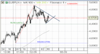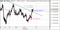 GBPUSD kontynuuje wzrosty, zyskując głównie na wartości dzięki słabości amerykańskiej waluty. Przełamana została linia trendu spadkowego i obecnie projekcja 141,4% podfali wzrostowej z poziomu 1,3660 w okolice 1,4220 wyznacz a opór w rejonie 1,4688. Z kolei 100-okresowa średnia ruchoma na wykresie dziennym przebiega w okolicy 1,4650. Najbliższe wsparcie widzielibyśmy na poziomie 1,44, które wyznacza przełamana linia trendu. Z technicznego punktu widzenia utrzymująca się słabość USD powinna sprzyjać wzrostom na funtdolarze.