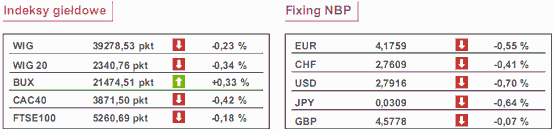 Początek sesji na GPW powinien przynieść korektę przynajmniej wczorajszego fixingu. Ponieważ obserwujemy rano wzrost notowań dolara i spadek ropy, co nie służy rynkom wschodzącym, zakres spadków może wydłużyć się choćby i do pokonanego wczoraj szczytu z sierpnia (okolice 2320 pkt dla WIG20). Generalnie jednak spodziewam się postawy wyczekującej niż aktywnego handlu w pierwszych godzinach sesji. Dziś w Stanach wyniki opublikuje Eli Lilly (farmacja), Boeing i bank Wells Fargo i są to chyba jedyne publikacje dnia zdolne kształtować nastroje rynkowe w końcówce notowań u nas.