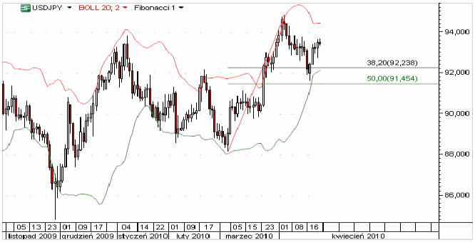 Kolejne minimum notowań eurodolara potwierdza obowiązujący trend spadkowy. Trwające odreagowanie świadczy o tym, że rynek próbuje utrzymać ostatni zakres. Korekta nie powinna przekroczyć strefy 1,34-1,3440. Z wydłużeń fibonacciego wynika, że możliwy zakres kolejnego impulsu spadkowego to 1,3138, co będzie wydłużeniem 1:1 impulsu marcowego. Kolejne wydłużenie (127,1%) wypada w pobliżu 1,2990. Odbicie na eurodolarze można tłumaczyć lepszymi danymi makro z Niemiec w postaci wyższego od oczekiwań odczytu indeksu Ifo. Dzisiaj popołudniu publikowane będą dane o zamówieniach na dobra trwałego użytku oraz dane o sprzedaży nowych domów.